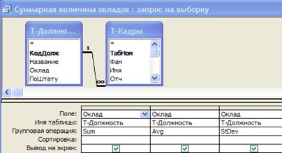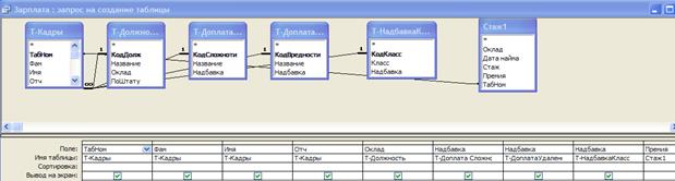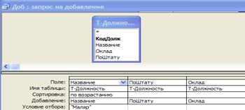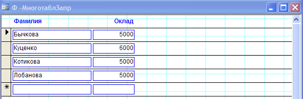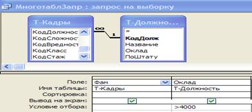 Рассмотрим форму созданную на основе многотабличного запроса. В ней отражаются фамилии сотрудников, чей оклад составляет более 4000 руб. Также с помощью данной формы возможно ввести данные в связанные таблицы Т-Кадры и Т-Должность (Рис.21).