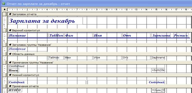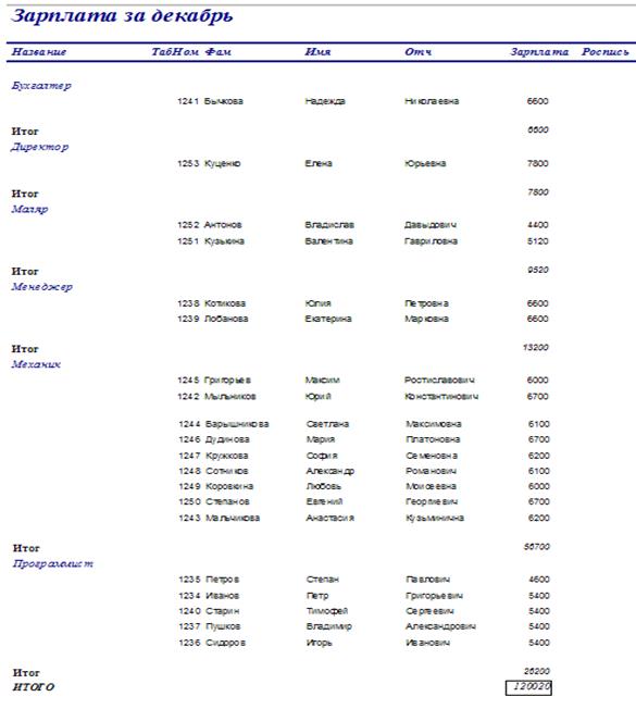 Например, создадим расчетную ведомость для нашего предприятия для регистрации выдачи зарплаты и отчет, содержащий фамилии работников и их зарплату, сгруппированные по должностям с итоговыми вычислениями.