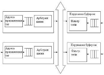 Кадр повинен передаватися по шині невеликими частинами, по декілька байт, щоб передача кадрів між декількома портами відбувалася в псевдопаралельному режимі, не вносячи затримок у передачу кадру в цілому. Вхідний блок процесора поміщає в комірку, прийнятний по шині, тег, у якому вказує номер порту призначення. Кожен вихідний блок процесора порту містить фільтр тегів, що вибирає теги, призначені даному порту. Шина, так само як і комутаційна матриця, не може здійснювати проміжну буферизацію, але тому що дані кадру розбиваються на невеликі комірки, то затримок з початковим очікуванням доступності вихідного порту в такій схемі немає - тут працює принцип комутації пакетів, а не каналів.