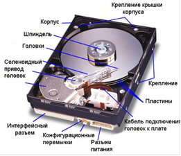 Весь винчестер, как устройство, делится на две крупные составляющие: плату электроники и гермозону или "камеру", внутри которой находятся магнитные диски (пластины) в просторечье именуемые "блинами", блок магнитных головок, шпиндельный двигатель и другие устройства. Внутреннее устройство большинства накопителей на жестких дисках практически одинаково (см. рис.1).