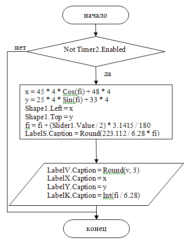 Представим графический алгоритм, в виде блок-схемы, для процедуры Private Sub Timer1_Timer(), отвечающей за передвижение тела по эллиптической траектории.