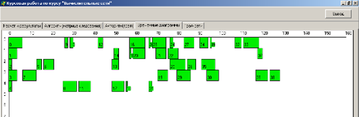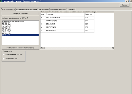 Разработанная в данной работе программа удовлетворяет техническому заданию. Алгоритм, лежащий в ее основе, позволяет получать оптимальное, с точки зрения времени решения задачи, распределение операторов алгоритма заданной задачи по нитям и нитей по процессорам структуры ВС типа обобщенный гипертор.