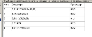 5. Вкладка распределения нитей по процессорам. Содержит описание структуры ВС с указанием, какой процессор выполняет какую нить, какой является транзитным и какой свободен. (рис.5)