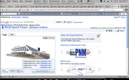 2) сформулировать запрос (“minsk sport palace”). В случае поиска модели конкретного объекта рационально воспользоваться подменю «Города в разработке».