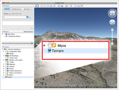 3. В Google Планета Земля переключитесь на трехмерный рельеф. Для этого нужно установить флажок "Рельеф" в списке слоев в левой части экрана.