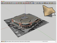 Приложение Google Earth содержит дополнительную аналитическую ГИС-информацию, объёмный рельеф, необходимые участки которого можно импортировать напрямую в SketchUP, импортируются все три измерения, а не только двухмерная карта. Пользователи SketchUp также избавлены от необходимости покупать карты высокого разрешения из Google Maps либо от склеивания их вручную в графических редакторах. Так, во время выполнения дипломной работы я использовала не только модель минского Дворца спорта из 3D Warehouse, но и отстроенный рельеф.