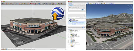При моделировании копий архитектурных сооружений можно легко импортировать аэро- или спутниковую фотографию нужного здания, а также топографию местности из Google Earth, а затем «строить» виртуальное здание-модель на фундаменте, которым будет спутниковая фотография здания-прототипа.Для того, чтобы увидеть только что созданную в программе SketchUp 3D-модель «в виртуальной жизни» на рельефе Google Earth, достаточно щёлкнуть иконку на панели инструментов. Для обмена информацией между программами достаточно, чтобы обе они были установлены на компьютере пользователя и одновременно открыты в момент работы