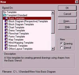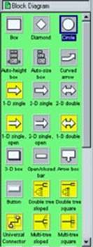 диалоговое окно с названием New, в котором можно выбрать готовый трафарет блок - схемы и приступить непосредственно к работе. Также можно и не выбирать трафарет. Внешний вид программы можно подразделить на 6 частей: 1) Окно для редактирования изображений. В нем производятся все основные действия, т.е. происходит редактирование рисунка. 2) Палитры инструментов и объектов, в том числе специализированных, для различных задач. При помощи всех этих вспомогательных инструментов и происходит редактирование рисунка, а также доработка до мельчайших подробностей. Например можно установить тип линии, задать начальные и конечные положения стрелок, установить цвет шрифта и много другое. 3) Окно для работы с трафаретами (если оно открыто).