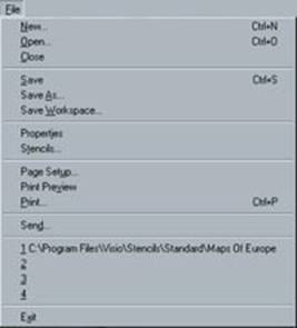 Опишем в дальнейшем самые главные функции всего меню в целом. В меню File можно увидеть такие команды как: New – это создание нового рабочего файла, Open – открывает готовый файл над которым вы уже работали, Close – закрывает текущий рабочий файл (если вы не сохранили все работу которую вы сделали, то по умолчанию вам предложат сохранить вашу работу), Save – сохранить все изменения и вообще все работу в целом, Save as – сохранить все изменения с различными расширениями (это нужно для того чтобы ваши данные созданные в программе Visio, можно было перенести в другие программы), Save Workspace – сохранение рабочей версии , Properties – задает свойства данного файла (имя создателя, ключевые слова, краткое описание и т.д.), Stencils – открыть в окне шаблонов еще один шаблон, Page Setup – параметры страницы, Print Preview – краткий просмотр страницы перед тем как распечатать, Print – печать, Send – отсылает всю вашу работу по электронной почте, Специальное меню которое запоминает с какими последними 4 рабочими файлами вы работали, Exit – выход из программы.