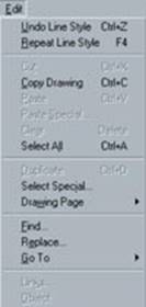 В меню Edit можно увидеть такие команды как: Undo Line Style – отменить последнее действие, Repeat Line Style – повторить отмененное действие, Cut – вырезать объект(ы), Copy Drawing – копировать все объекты рабочего стола (здесь также применима команда Copy – копировать один или выделенные объекты), Paste –вставить скопированный или вырезанный объект(ы), Paste Special –специальные вставки, Clear – удаление объекта, Select All – выделить все, Duplicate – создать дубликат объекта, Select Special –специальное выделение, Drawing Page – это команда содержит в себе 4 настройки: Properties – свойства страницы , Size/ Scale – размеры, Delete – удаление всех графических объектов из окна редактирования, Reorder – переупорядочить, Find – поиск, Replace – нахождение и замена текста, Go To – переход к странице, Links – ссылка, Object – объект.