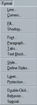 МенюFormat включаетвсебяследующиекоманды: Line – свойствалинии, Corners – углыизгиба, Fill – заполнение, Shadow – тень, Font – типшрифтаиегопараметры, Paragraph – определениепараграфа, Tabs – позициятабуляции, Text Block – вставитьтекстовойблок, Style – стиль, Define Styles – параметрыстиля, Layer – уровень, Protection – защита (непозволяетменятьконтрольныеточки), Double-Click – настройкадвойногощелчкамышинаобъекте, Behavior – настройкапрограммы (делятсянакатегорииInteraction Style , Selection Highlighting , Resize Behavior ), Special – специальныепараметрыобъекта.