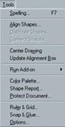 ВменюTools входяткоманды: Spelling – проверкаправописания, Align Shapes – выравниваниеобъектов (форм) погоризонталиивертикали, Distribute Shapes – распределительформ, Connect Shapes – подключениеформ, Center Drawing – установкацента, Update Alignment Box – модификациявыделенныхформ, Run Add-on – добавлениетаблицсзаданнымипараметрами, Color Palette – цветоваяпалитра, Shape Report – формасообщений, Protect Document – защитадокумента (спомощьюпароля), Ruler & Grid – установкилинейкиисетки, Snap & Glue – привязкикобъектам, Options – настройкипрограммы.