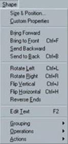 В меню Shape входят такие команды как: Size & Position – размер и позиция, Custom Properties – выборочные свойства, Bring Forward – выдвинуть вперед, Bring to Front – перенос к передней стороне, Send Backward – послать назад, Send to Back – послать назад, Rotate Left – вращать влево, Rotate Right – вращать вправо, Flip Vertical – отразить вертикаль, Flip Horizontal – отразить горизонталь, Reverse Ends – вращение вершин на 180°, Edit Text – редактирование текста, Grouping – группировка объектов, Operations – различные действия над объектами (комбинирование, объединение, вычитание и т.д.), Actions – различные операции с линиями и масштабами объектов.