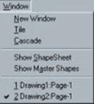 В меню Windows находятся такие команды как: New Window – создать новое рабочее окно, Tile – выстраивает рабочие окна по порядку, Cascade – выстраивает рабочие окна каскадом, Show Shape Sheet – ведомость формы показа, Show Master Shapes – формы показа хозяина, затем следуют в порядке возрастания все открытые рабочие окна (сделано для простоты переключения между ними).