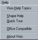В меню Help входят команды: Visio Help Topics – справочная система по программе Visio, Shape Help – помощь по выделенной фигуре, Quick Tour – интерактивное обучение программе Visio, Office Compatible – дополнительная информация о совместимости Visio с другими программами MicrosoftOffice, About Visio – некоторые сведения о программе Visio.