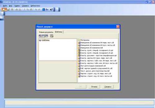 После загрузки программы на экране появятся два окна: окно КОМПАС-3D и окно «Новый документ», в котором следует указать параметры нового документа. В окне «Новый документ» можно выбрать параметры листа, рамки или загрузить в программу какой-либо из представленных шаблонов.