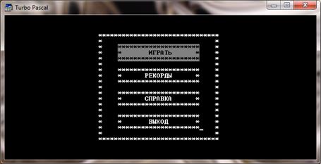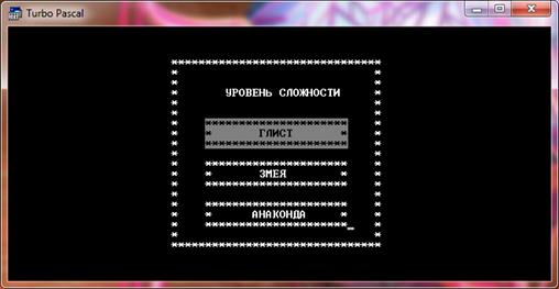 После нажатия любой клавиши мы вернулись опять же в меню "Справка". После выбора вкладки "Назад" мы возвращаемся в главное меню. Выбираем вкладку "Играть". Появляется меню выбора уровня сложности (Рис.8.6).