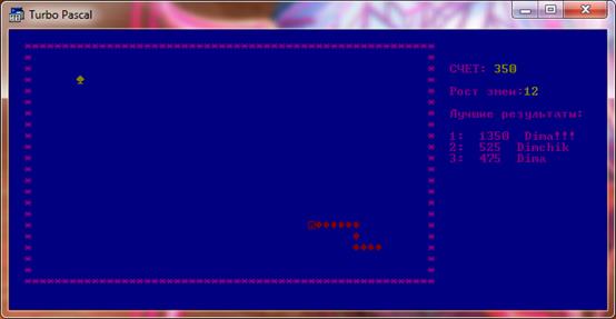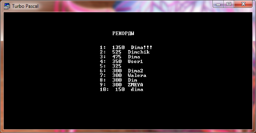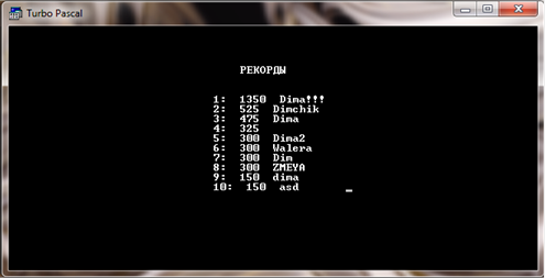 Также в моей программе я использовал типизированные файлы. Так информация о разработчике хранится в файле под названием Avtor. pas, правила игры хранятся в файле Pravila. pas. Таблица рекордов хранится в файле Itog. txt. Для того чтобы работать с рекордами (сравнивать результаты и сортировать таблицу результатов) мне потребовалось отдельный файл в котором хранятся только рекорды (Rec. dat), и файл в котором хранятся имена пользователей (Imena. txt).