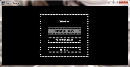 После нажатия любой кнопки мы возвращаемся в главное меню. Выбираем меню "Справка". Перед нами появляется Меню 2-го уровня - "Справка" со вкладками "Правила игры", "Разработчик" и "Назад" (Рис.8.3).