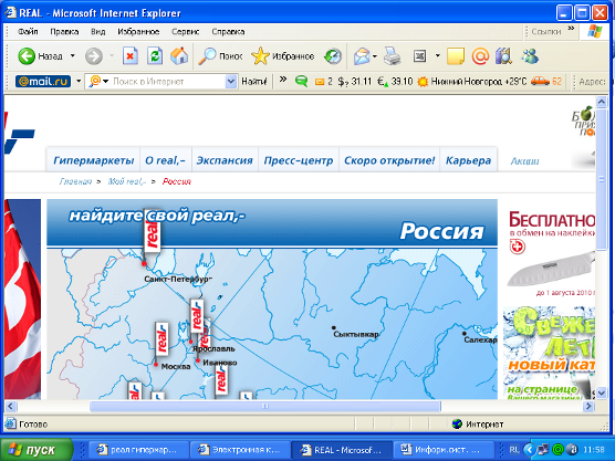 - Коммерческая функция. Во всем мире активно развивается торговля по сети. Покупатель просматривает на экране компьютера товары, заказывает и оплачивает их (существует официальный сайт «реал, - Гипермаркета», где можно просматривать проходящие акции товаров, мероприятия праздников; адреса и контакты всей сети и т.п. - www.real.ru (П1));