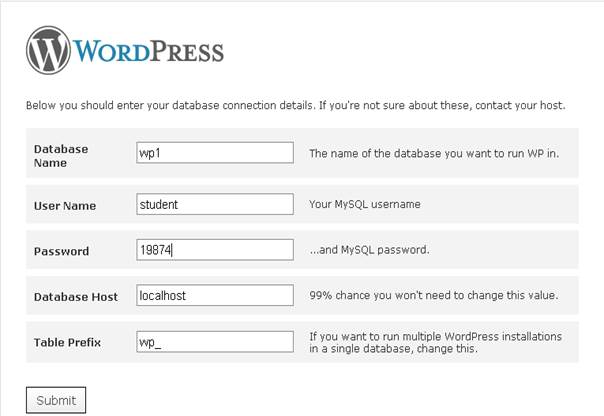 Последний шаг установки. Здесь вам нужно ввести: имя базы данных, имя пользователя базы данных и пароль пользователя базы данных