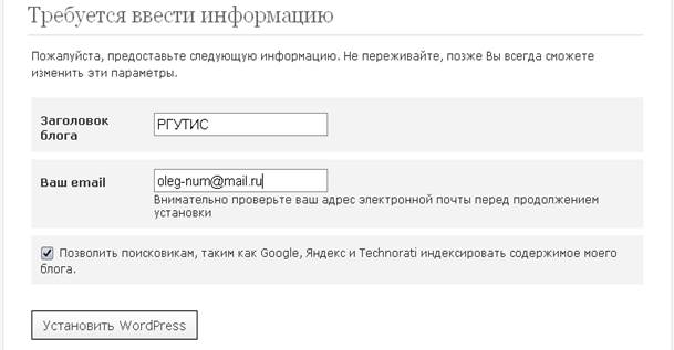 Затем жмите кнопку “Запуск инсталляции”. В следующем окне вводите название блога и e-mail. Затем система выдаст вам логин admin и пароль. Запишите пароль. Он нужен для входа в админ панель Wordpress.