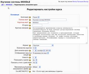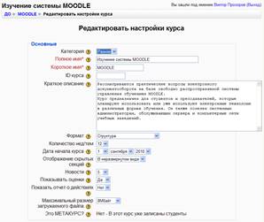 щелкните по ссылке Установки для редактирования параметров вашего курса. Установим формат курса типа Структура и зададим количество тем равное 12, дадим полное и короткое имя для курса и заполним поле Краткое описание: