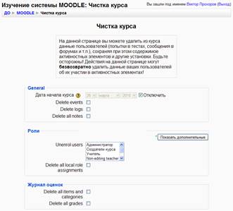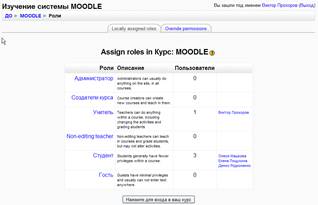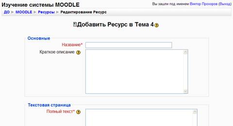 Предположим, что администратор системы создал новый обучающий курс "Изучение системы MOODLE" и предоставил вам права преподавателя на данный курс.