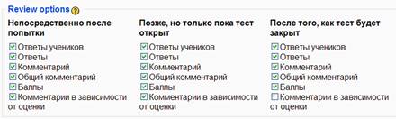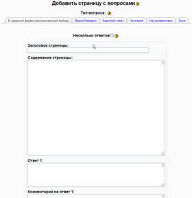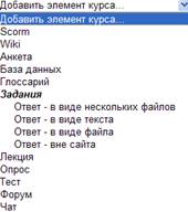 Тест. Этот элемент позволяет преподавателю создать набор тестовых вопросов. Все вопросы хранятся в базе данных и могут быть впоследствии использованы снова в этом же курсе (или в других). По результатам тестирования выставляется оценка (либо в автоматическом режиме, либо вручную). Тест может содержать различные типы вопросов (множественный выбор, верно/неверно, числовой и др).