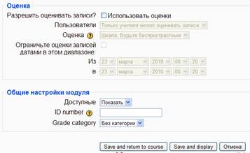позволяют задать шкалу оценивания и диапазон дат, в котором сообщение будет оценено преподавателем. Если не устанавливать флаг Использовать оценивание, то инструменты выставления оценок и соответственно просмотр оценок по форуму будут не доступны.