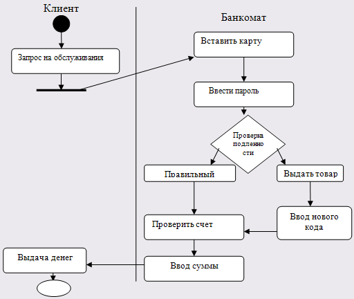 Показывают выполнение операций. Предназначение данной диаграммы – показать поток управления, внутренний для операции. Диаграмма действий разделена на 2 полосы, которые включают в себя определенный набор действий и переходов. Каждая полоса имеет свое имя: клиент и менеджер по продажам, и тем самым позволяет группировать действия в единое целое. Графически каждая полоса представляет собой вертикальное разделение диаграммы с помощью сплошной полосы. Каждое действие может находиться только в одной полосе, а переходы могут пересекать полосы.