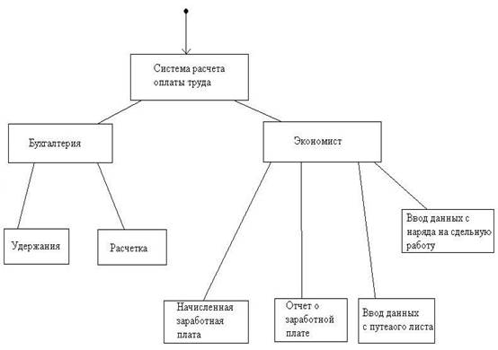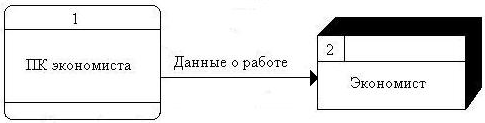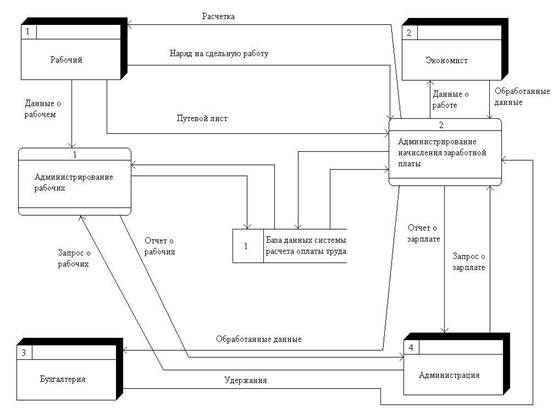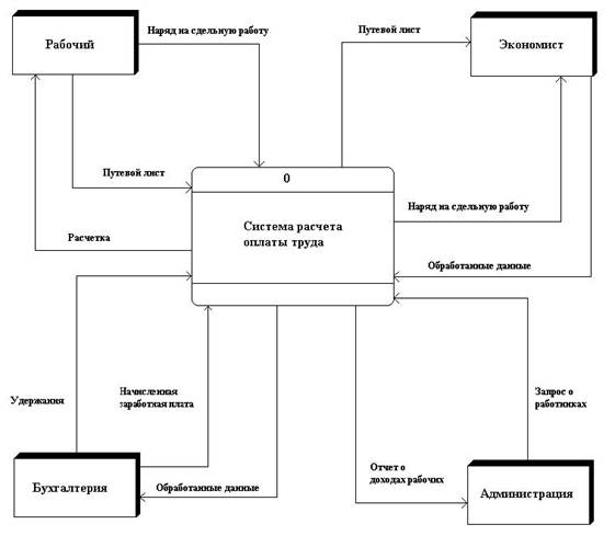 Построим начальную контекстную диаграмму потоков данных в нотации Гейна – Сэрсона. Нарисуем нулевой процесс и присвоим ему имя системы (Система расчета оплаты труда). Поскольку моделируется деятельность бухгалтерии, внешними сущностями являются Бухгалтерия, Экономист, Рабочий, Администрация. Нарисуем внешние сущности и соединим их с нулевым процессом посредством потоков данных. Начальная диаграмма представлена на рис. 6.