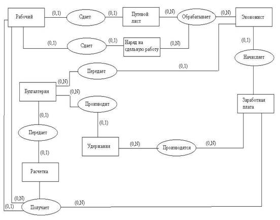 Выделим и нарисуем сущности для каждого класса объектов данных в системе расчета оплаты труда. Рассмотрим каждую возможную пару сущностей и установим существование связи между ними. Нарисуем диаграмму «сущность-связь». Присвоим им наименование каждой связи и зададим ее характеристики. Концептуальная модель данных представлена на рис. 7.