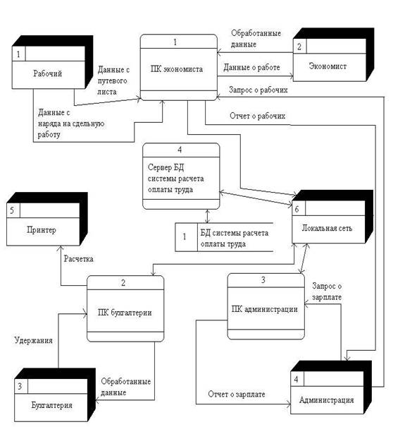 Устанавливаются ссылки между задачами и процессами диаграмм потоков данных следующих уровней. На рис. 10 изображена диаграмма системных процессов, в которой имеется шесть сущностей (рабочие, экономист, бухгалтерия, администрация, принтер, локальная сеть). Также имеется четыре процесса «ПК экономиста», «ПК администрации», «ПК бухгалтерии», «Сервер базы данных системы расчета оплаты труда». При поступлении данных от рабочего, данные сохраняются в базе данных и затем обрабатываются экономистом и бухгалтерии. Затем сумма к выдаче посылается на принтер в виде расчетки и выдается рабочему.