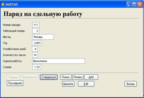 На форме имеются кнопки: «Первая» - возвращает на первую запись в форме, «Предыдущая» - возвращает на предыдущую запись, «Следующая» - вызывает следующую запись в форме, «Последняя» - переносит на последнюю запись в форме, «Поиск» - выполняет поиск записей в форме, «Печать» - выводит форму на печать, «Удалить» - удаляет запись из формы, «Add» - добавить запись в форму, «Edit» - изменить запись в форме и «Выход» - выход из формы. Наряд на сдельную работу представлен в «Приложение 2»