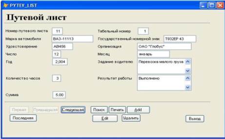 На рис.14 показана форма «Путевой лист» в которой указывается: номер путевого листа, марка автомобиля, табельный номер рабочего, государственный номерной знак, номер удостоверения, название организации, число, месяц, год, задание водителю, колич. часов, результат работы, сумма. Путевой лист также представлен в «Приложение 1».