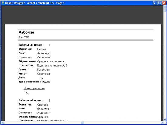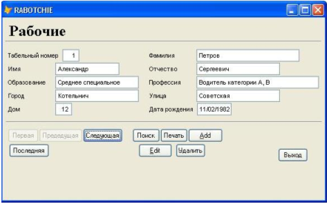 На рис. 15 показана форма «Рабочие» в которую заносятся данные о рабочих: табельный номер рабочего, фамилия, имя, отчество, образование, профессия, город, улица, дом, дата рождения.