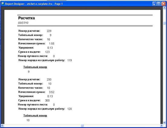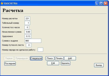 На рис. 16 показана форма «Расчетка» в которую заносятся следующие данные: номер расчетки, табельный номер рабочего, количество отработанных часов, начисленная сумма, удержания, сумма к выдаче, номер путевого листа, номер наряда на сдельную работу.