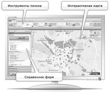 Одной из самых распространенных социально-направленных ГИС является ДубльГИС. [5]ДубльГИС — бесплатный электронный справочник предприятий с интерактивной картой города. Выпускается одноимённой фирмой и её франчайзи в 35 городах России и Украины. У организаций есть возможность бесплатно добавлять в справочник и обновлять информацию о себе. Свежие версии с обновлениями информации, интерфейса и исправлениями ошибок выпускаются каждый месяц. Есть он-лайн версия и версия для КПК (Карманный персональный компьютер). В интерфейсе и справочнике размещается платная реклама.