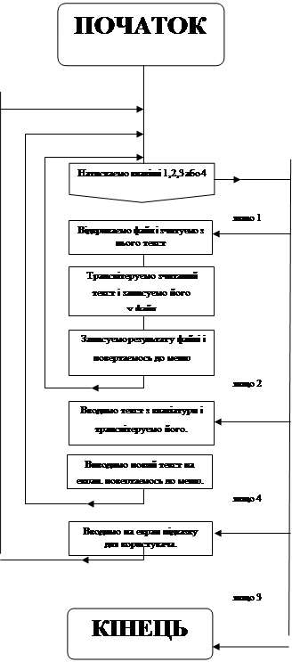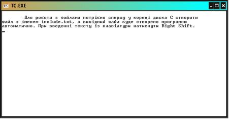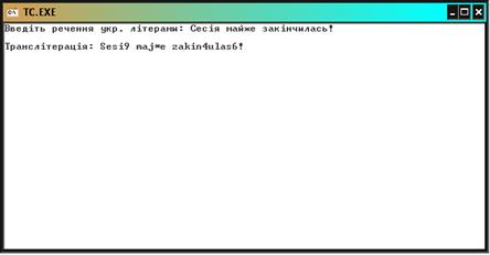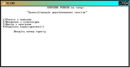 Дана програма повинна транслітерувати заданий текст. Також я повинен реалізувати у цій програмі введення тексту з клавіатури або зчитування його із файлу. Для реалізації цієї програми я використовую усі можливі оператори мови С, і для читання з клавіатури «пропатчую» систему