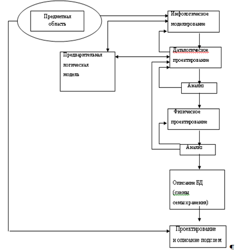 В некоторых СУБД, помимо описания общей логической структуры базы данных, имеется возможность описать логическую структуру БД с точки зрения конкретного пользователя. Такая модель называется внешней, а её описание называется подсхемой. Использование подсхем облегчает работу пользователя, так как он должен знать структуру не всей БД, а только той её части, которая имеет к нему непосредственное отношение. Последовательность этапов проектирования изображена на рисунке 2.