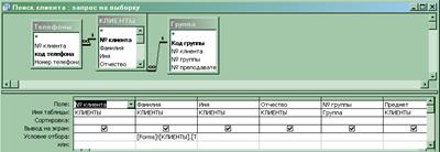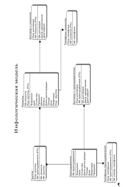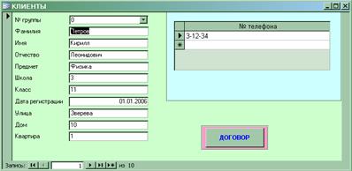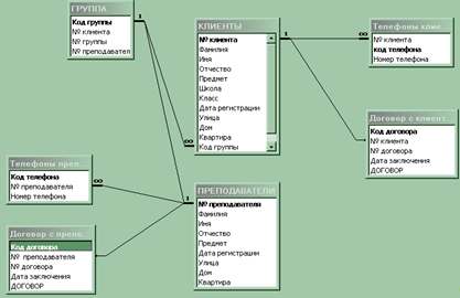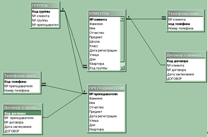 Основой любой БД, создаваемой в Access, являются таблицы. В них содержится полное описание всех полей, которые содержит данная БД, с описанием типа поля и его краткой характеристикой. Создать таблицу можно как при помощи мастера таблиц, так и в режиме конструктора. Одним из условий устойчивой работы БД, разрабатываемой в Access, является правильное разбитие данных по нескольким таблицам и создание связей между этими таблицами. В БД “Репетитор” вся информация разбита на семь таблиц содержащих данные о клиентах и преподавателях.