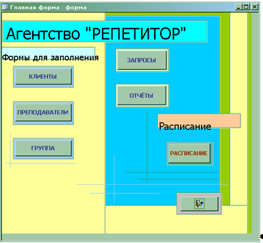 Задача агентства «Репетитор» - в короткие сроки находить своим клиентам преподавателя для занятий в группе или индивидуально. При этом необходимо учитывать свободное время, как преподавателя, так и ученика, а также адреса их места жительства или постоянной работы. Поиск преподавателя по определенному предмету благодаря автоматизированному учету данных займет несколько секунд.