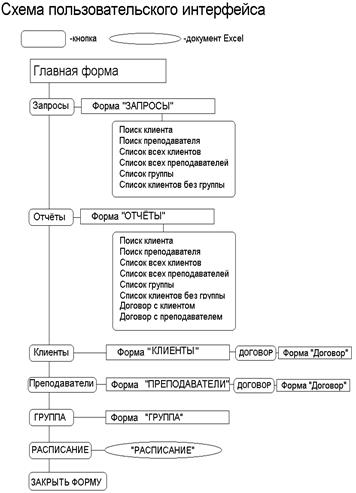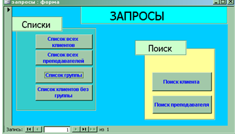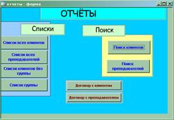 Договор с преподавателем | Договор с клиентом | Отчёт - список группы | Отчёт – список клиентов без группы | Отчёт - должники | Резюме преподавателя | Заявка клиента |