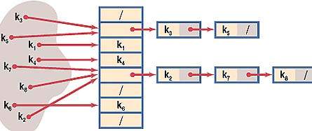 В первом случае выбирается некая хеш-функция h(k) = i, где i трактуется как индекс в таблице списков t. Поскольку нельзя гарантировать, что не встретится двух разных ключей, которым соответствует один и тот же индекс i (конфликт, коллизия), такие «однородные» ключи просто помещаются в список, начинающийся в i-ячейке хеш-таблицы t (см. рисунок).