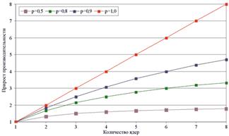 Рисунок 5 - Зависимость прироста производительности от числа ядер процессора