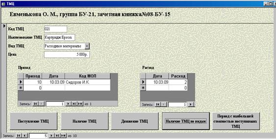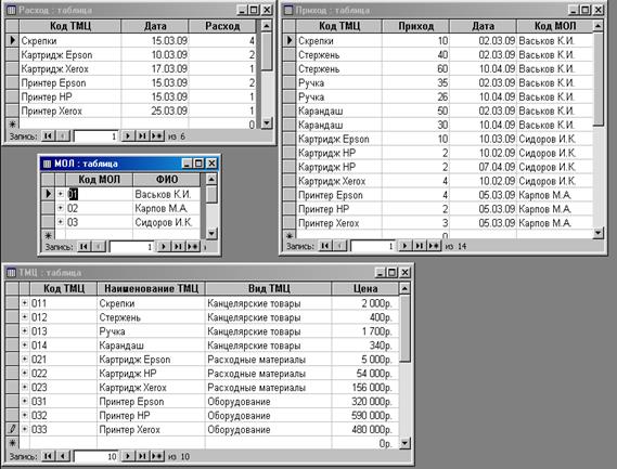 При выполнении контрольной работы была спроектирована база данных «ТМЦ», содержащая таблицы «МОЛ», «ТМЦ», «Приход» и «Расход». Значения таблицы «МОЛ» используются при вводе данных в таблицу «Приход», значения таблицы «ТМЦ» используются при вводе данных в таблицы «Приход» и «Расход».