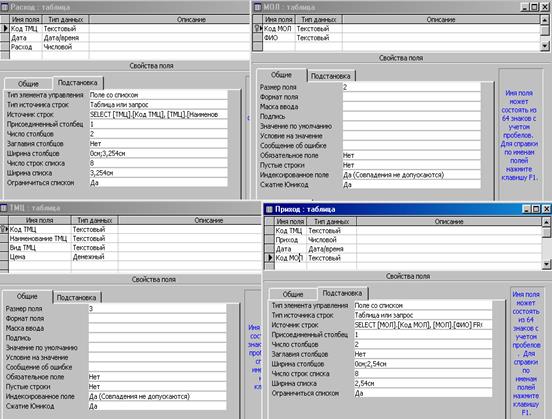 | Код ТМЦ | Текстовый | Размер поля – 3, подстановка поля Код ТМЦ таблицы «ТМЦ» |