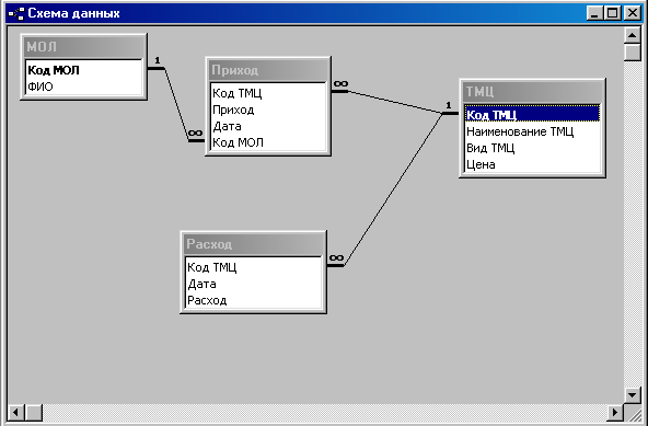 По ключевому полю Код МОЛ таблицы «МОЛ» и полю Код МОЛ таблицы «Приход» установлена связь. Эти поля имеют одинаковый тип данных и одинаковые значения свойств. Тип установленной связи – один ко многим. Между таблицами «ТМЦ», «Приход» и «Расход» по полю Код ТМЦ установлена связь один ко многим, поле Код ТМЦ является ключевым для таблицы «ТМЦ».