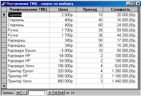 | Запросы | Поступление товарно-материальных ценностей | Наименование ТМЦ, цена, количество, стоимость (цена * количество) |